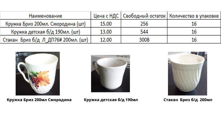 Внимание: разовая акция! Небольшая партия кружек и стаканов закрывшегося Дружковского фарфорового завода поступила на наш склад. В обозримом будущем новых поступлений не ожидается.